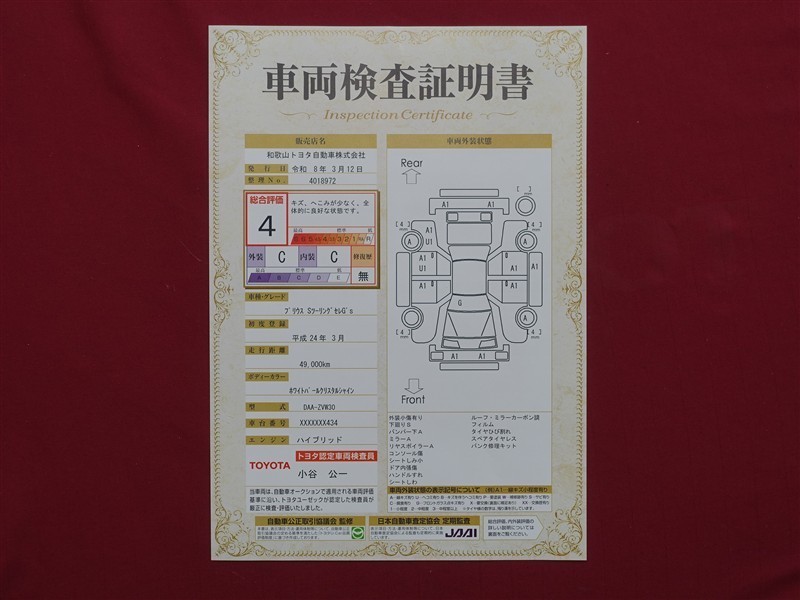 日本自動車査定協会の監査確認証付きです。ご安心してご検討下さい。
