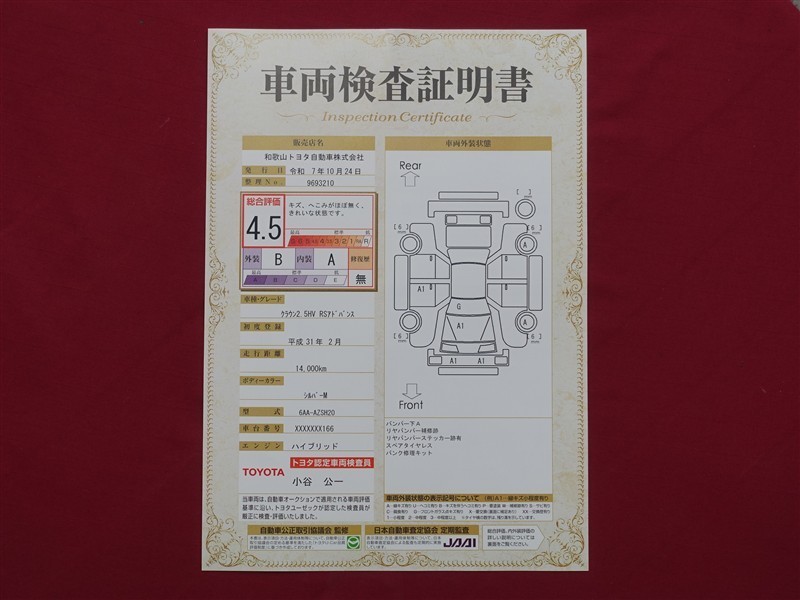 日本自動車査定協会の監査確認証付きです。ご安心してご検討下さい。