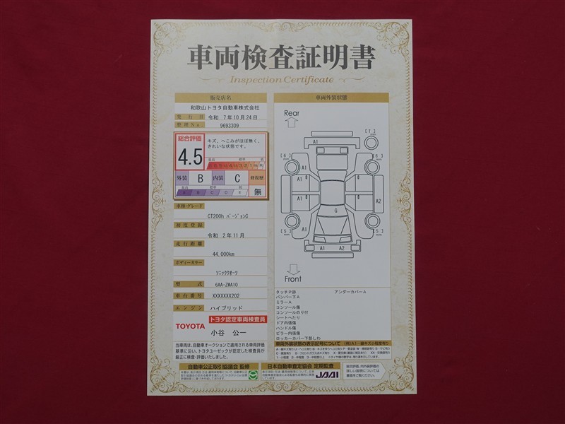 トヨタの認定検査員により、クルマの状態を点数と図解で表示したもので、総合評価は11段階、内装・外装は5段階で点数表示。外装は、キズの程度と場所が一目で分かるよう車両展開図も記載しています。