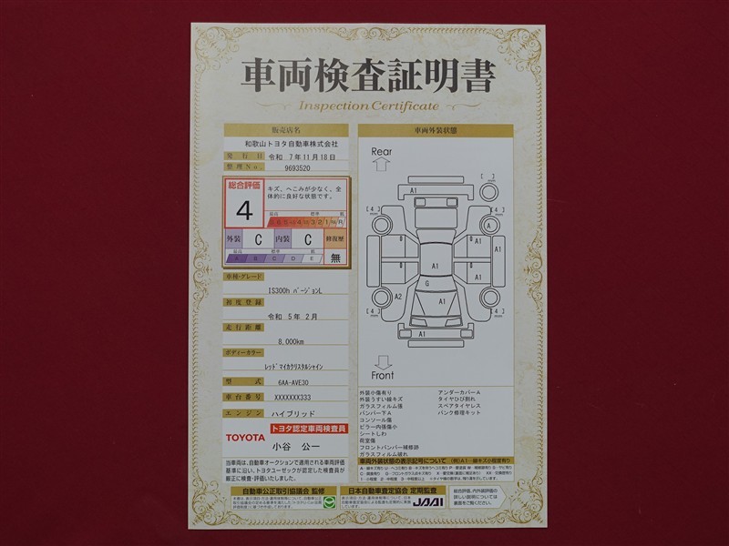 日本自動車査定協会の監査確認証付きです。ご安心してご検討下さい。
