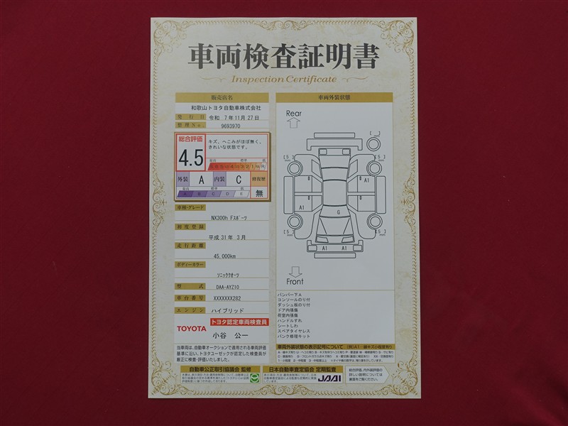 表示項目・方法・運用体制等について、自動車公正取引協議会の定める基準を満たした「トヨタU-Car品質評価制度」に基づき作成しております。