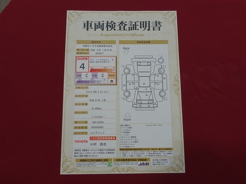 日本自動車査定協会の監査確認証付きです。ご安心してご検討下さい。