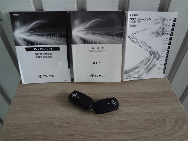 【取説とエンジンキー】スマートキーと取扱説明書です。スマートキーを携帯していれば、ドアノブに触れるだけでドアの解錠・施錠が可能です。取扱説明書では、車の機能もしっかり確認できます。