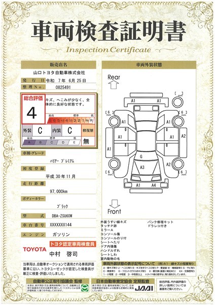 【車両検査証明書】トヨタ車のプロの検査員が実施した「車両検査証明書」付き!車両の状態をこれ1枚でチェックできます!