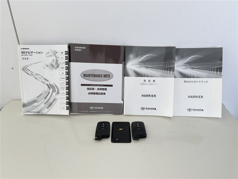 【取説とエンジンキー】スマートキーと取扱説明書です。スマートキーを携帯していれば、ドアノブに触れるだけでドアの解錠・施錠が可能です。取扱説明書では、車の機能もしっかり確認できます。