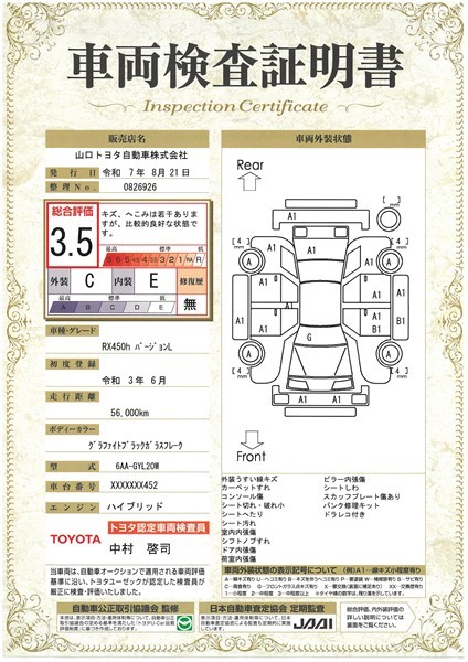 【車両検査証明書】トヨタ車のプロの検査員が実施した「車両検査証明書」付き!車両の状態をこれ1枚でチェックできます!