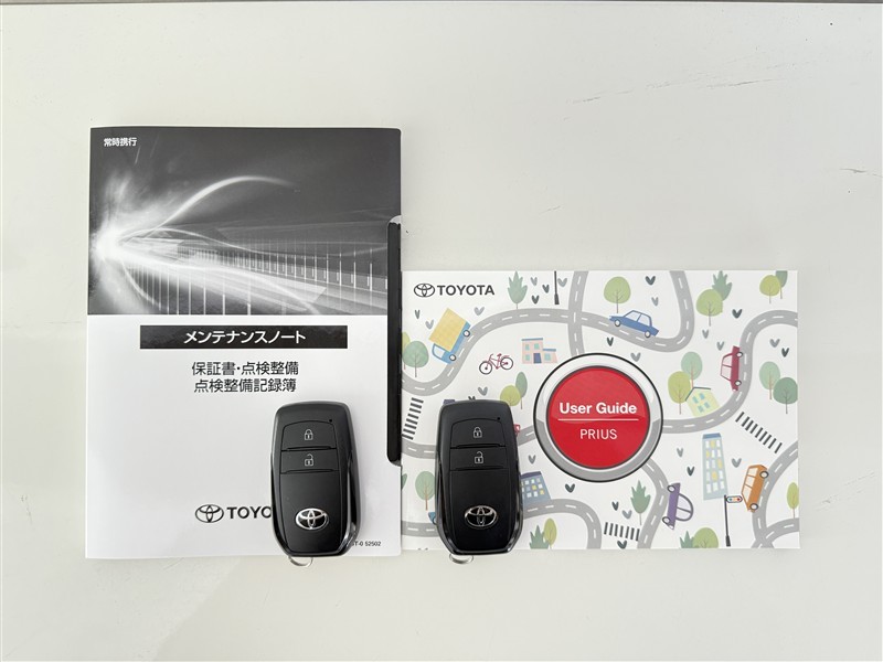 【取説とエンジンキー】スマートキーと取扱説明書です。スマートキーを携帯していれば、ドアノブに触れるだけでドアの解錠・施錠が可能です。取扱説明書では、車の機能もしっかり確認できます。