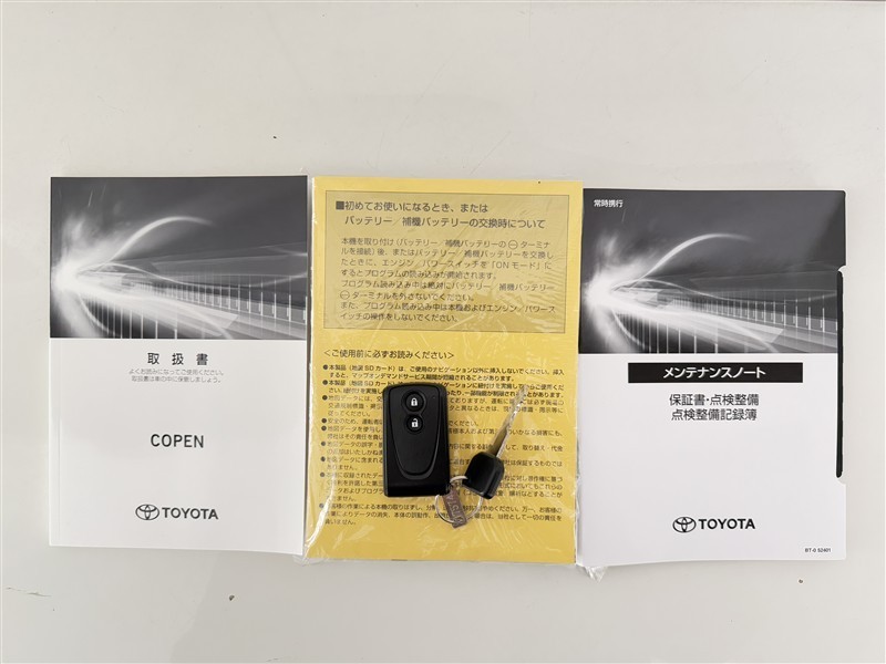 【取説とエンジンキー】スマートキーと取扱説明書です。スマートキーを携帯していれば、ドアノブに触れるだけでドアの解錠・施錠が可能です。取扱説明書では、車の機能もしっかり確認できます。