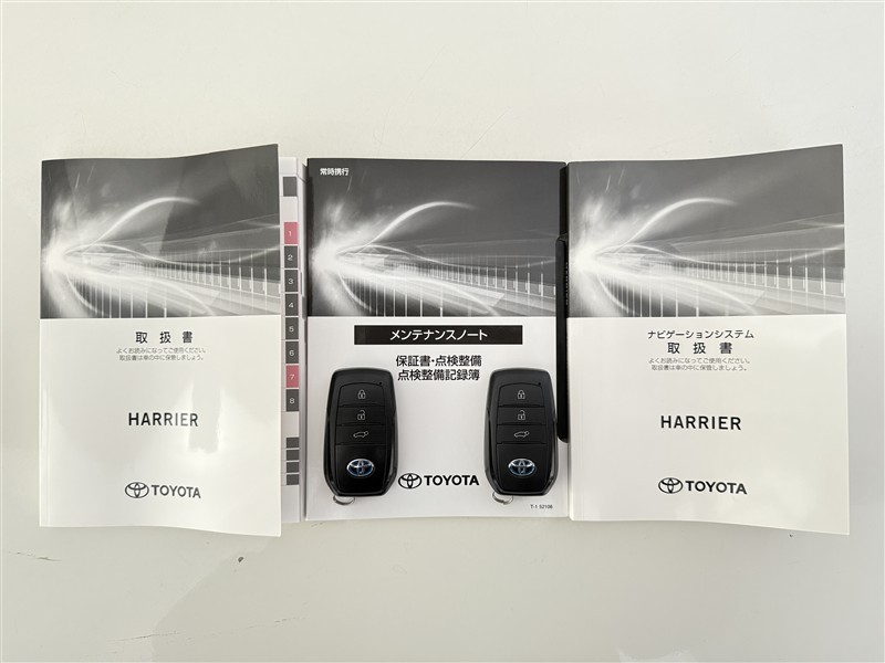 【取説とエンジンキー】スマートキーと取扱説明書です。スマートキーを携帯していれば、ドアノブに触れるだけでドアの解錠・施錠が可能です。取扱説明書では、車の機能もしっかり確認できます。