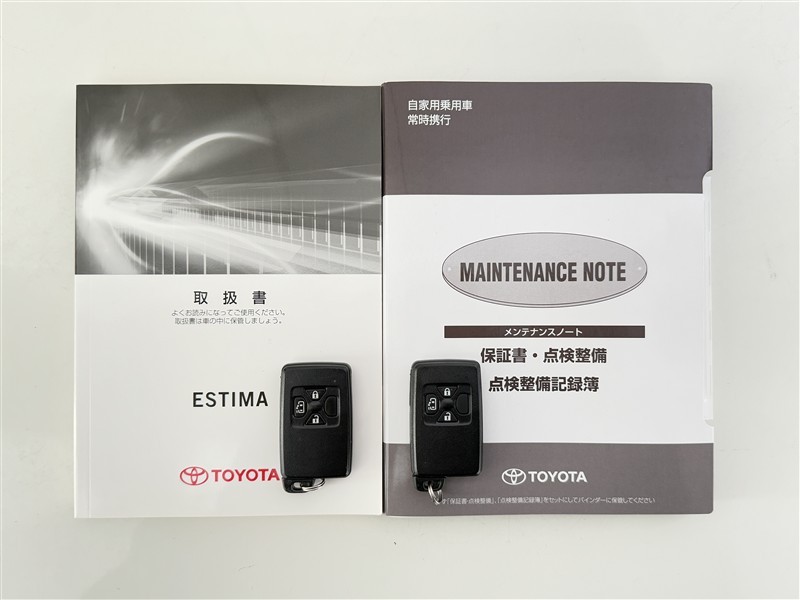 【取説とエンジンキー】スマートキーと取扱説明書です。スマートキーを携帯していれば、ドアノブに触れるだけでドアの解錠・施錠が可能です。取扱説明書では、車の機能もしっかり確認できます。