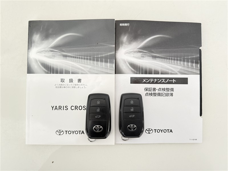 【取説とエンジンキー】スマートキーと取扱説明書です。スマートキーを携帯していれば、ドアノブに触れるだけでドアの解錠・施錠が可能です。取扱説明書では、車の機能もしっかり確認できます。