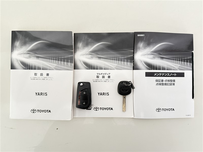 【取説とエンジンキー】スマートキーと取扱説明書です。スマートキーを携帯していれば、ドアノブに触れるだけでドアの解錠・施錠が可能です。取扱説明書では、車の機能もしっかり確認できます。