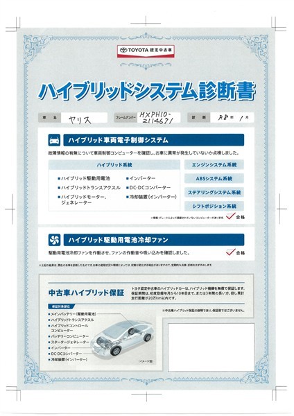 【ハイブリッドシステム診断書】ハイブリッド機構を無償で保証します。保証期間は、初度登録年月から10年目まで、または3年間の長い方。ただし累計走行距離が20万km以内です。