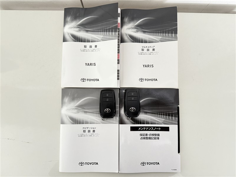 【取説とエンジンキー】スマートキーと取扱説明書です。スマートキーを携帯していれば、ドアノブに触れるだけでドアの解錠・施錠が可能です。取扱説明書では、車の機能もしっかり確認できます。
