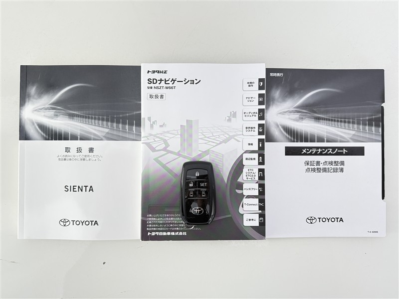 【取説とエンジンキー】スマートキーと取扱説明書です。スマートキーを携帯していれば、ドアノブに触れるだけでドアの解錠・施錠が可能です。取扱説明書では、車の機能もしっかり確認できます。