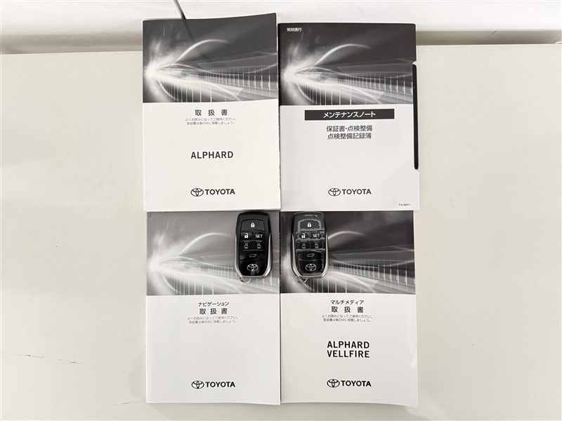 【取説とエンジンキー】スマートキーと取扱説明書です。スマートキーを携帯していれば、ドアノブに触れるだけでドアの解錠・施錠が可能です。取扱説明書では、車の機能もしっかり確認できます。