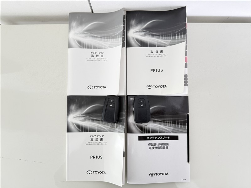 【取説とエンジンキー】スマートキーと取扱説明書です。スマートキーを携帯していれば、ドアノブに触れるだけでドアの解錠・施錠が可能です。取扱説明書では、車の機能もしっかり確認できます。