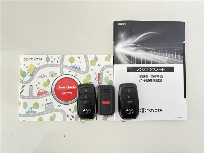 【取説とエンジンキー】スマートキーと取扱説明書です。スマートキーを携帯していれば、ドアノ ブに触れるだけでドアの解錠・施錠が可能です。取扱説明書では、車の機能もしっかり確認できます。