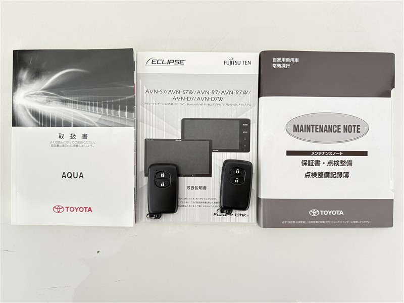 【取説とエンジンキー】スマートキーと取扱説明書です。スマートキーを携帯していれば、ドアノブに触れるだけでドアの解錠・施錠が可能です。取扱説明書では、車の機能もしっかり確認できます。