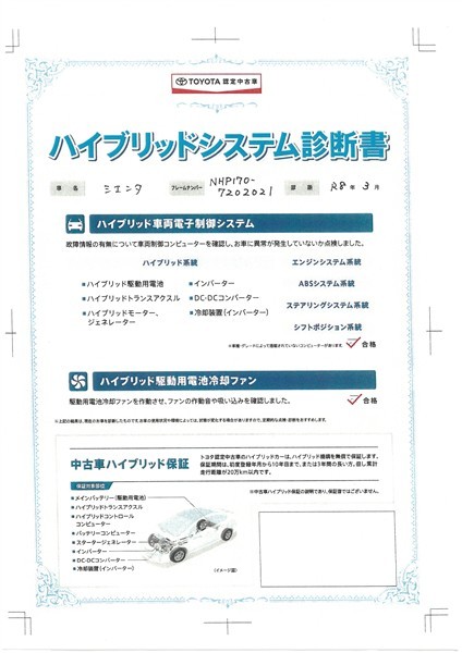 【ハイブリッドシステム診断書】ハイブリッド機構を無償で保証します。保証期間は、初度登録年月から10年目まで、または3年間の長い方。ただし累計走行距離が20万km以内です。