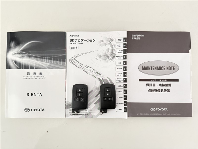 【取説とエンジンキー】スマートキーと取扱説明書です。スマートキーを携帯していれば、ドアノブに触れるだけでドアの解錠・施錠が可能です。取扱説明書では、車の機能もしっかり確認できます。