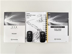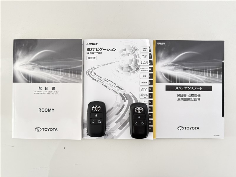 【取説とエンジンキー】スマートキーと取扱説明書です。スマートキーを携帯していれば、ドアノブに触れるだけでドアの解錠・施錠が可能です。取扱説明書では、車の機能もしっかり確認できます。