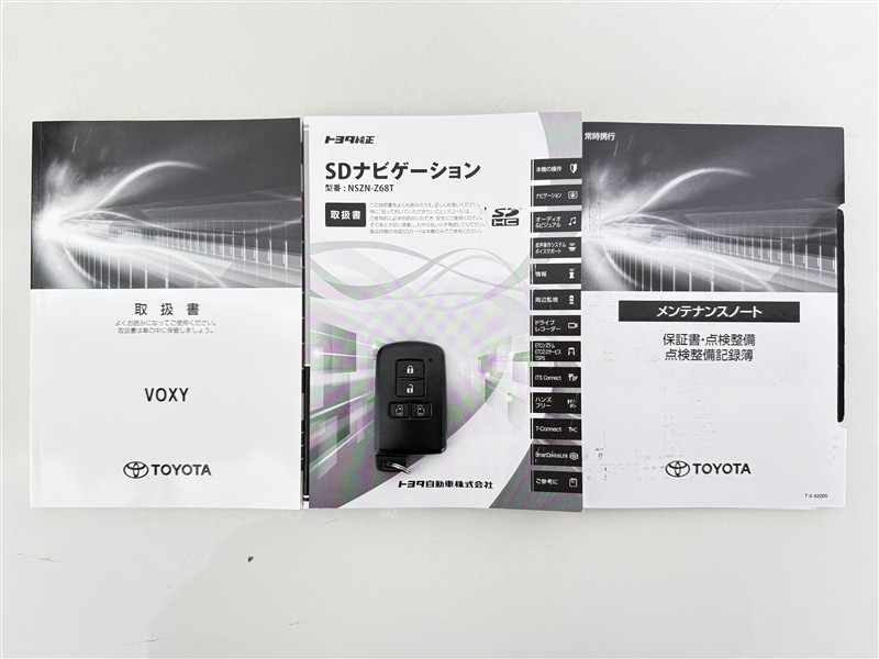 【取説とエンジンキー】スマートキーと取扱説明書です。スマートキーを携帯していれば、ドアノブに触れるだけでドアの解錠・施錠が可能です。取扱説明書では、車の機能もしっかり確認できます。