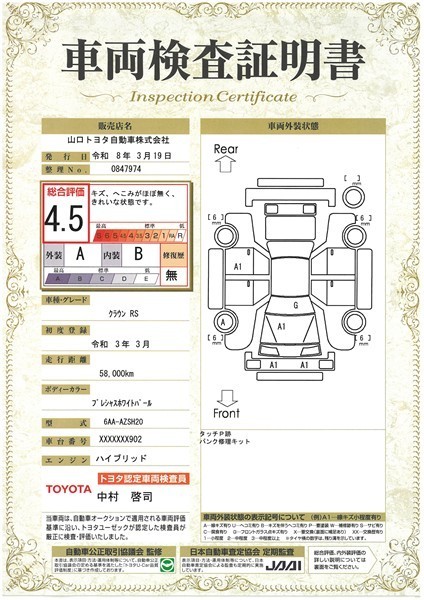 【車両検査証明書】トヨタ車のプロの検査員が実施した「車両検査証明書」付き!車両の状態をこれ1枚でチェックできます!