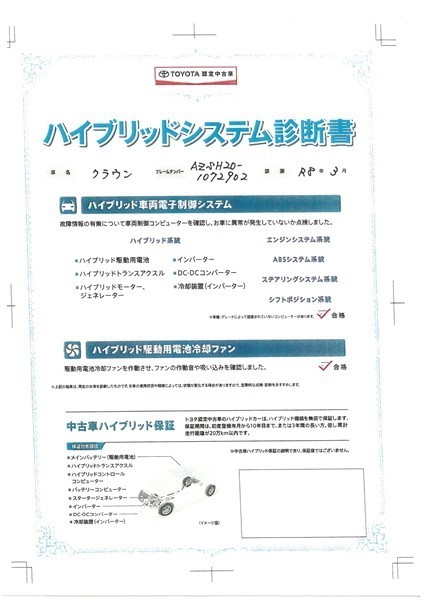 【ハイブリッドシステム診断書】ハイブリッド機構を無償で保証します。保証期間は、初度登録年月から10年目まで、または3年間の長い方。ただし累計走行距離が20万km以内です。