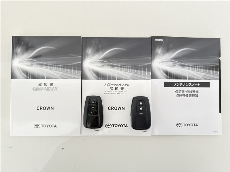 【取説とエンジンキー】スマートキーと取扱説明書です。スマートキーを携帯していれば、ドアノブに触れるだけでドアの解錠・施錠が可能です。取扱説明書では、車の機能もしっかり確認できます。