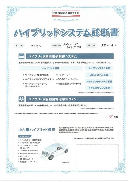 【ハイブリッドシステム診断書】ハイブリッド機構を無償で保証します。保証期間は、初度登録年月から10年目まで、または3年間の長い方。ただし累計走行距離が20万km以内です。