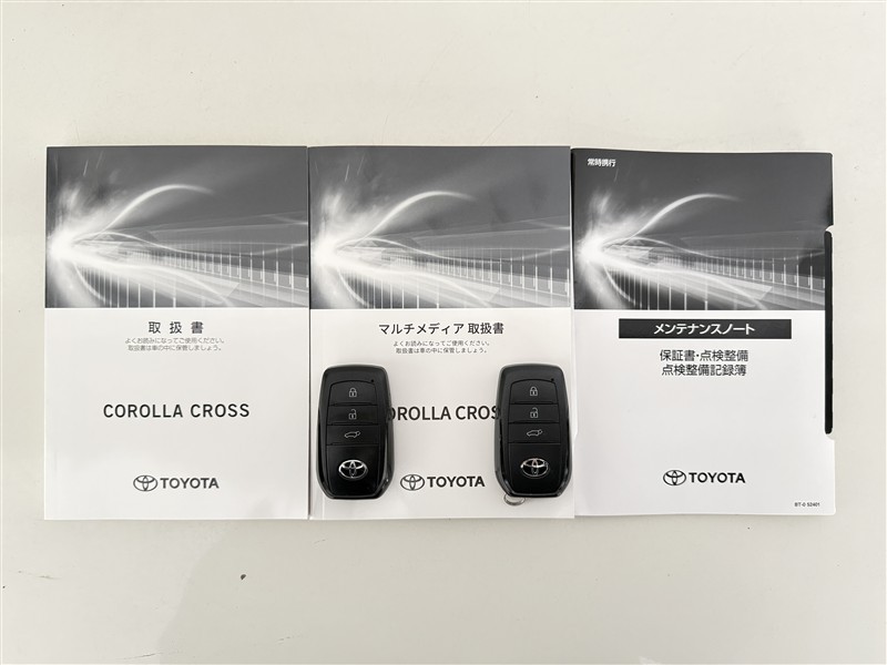 【取説とエンジンキー】スマートキーと取扱説明書です。スマートキーを携帯していれば、ドアノブに触れるだけでドアの解錠・施錠が可能です。取扱説明書では、車の機能もしっかり確認できます。