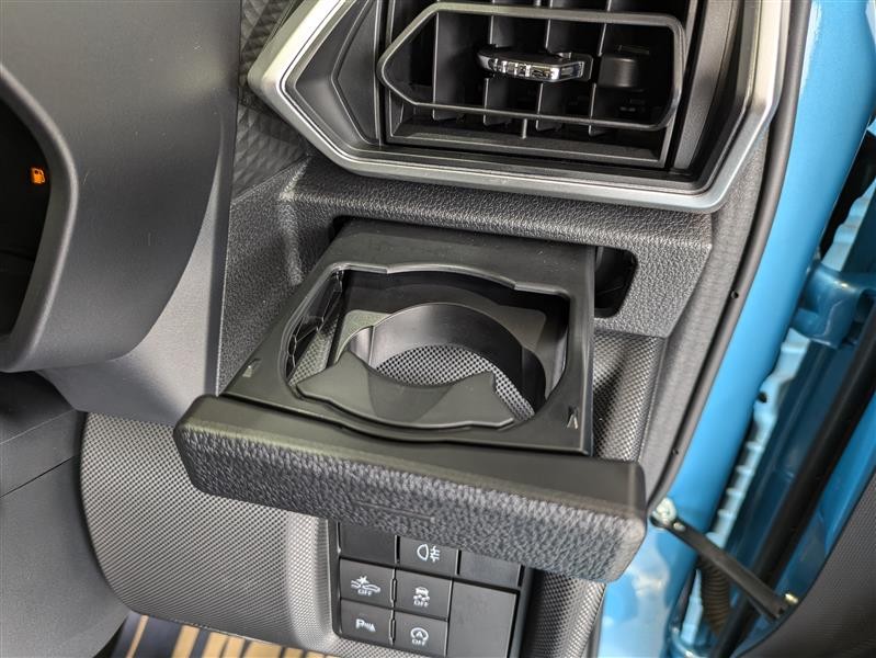 便利なカップホルダーを装備しています。 缶ジュースを開けて運転していると振動で倒れないかヒヤヒヤ、意外と置き場に困るもの。 意外に重要な装備ですね。