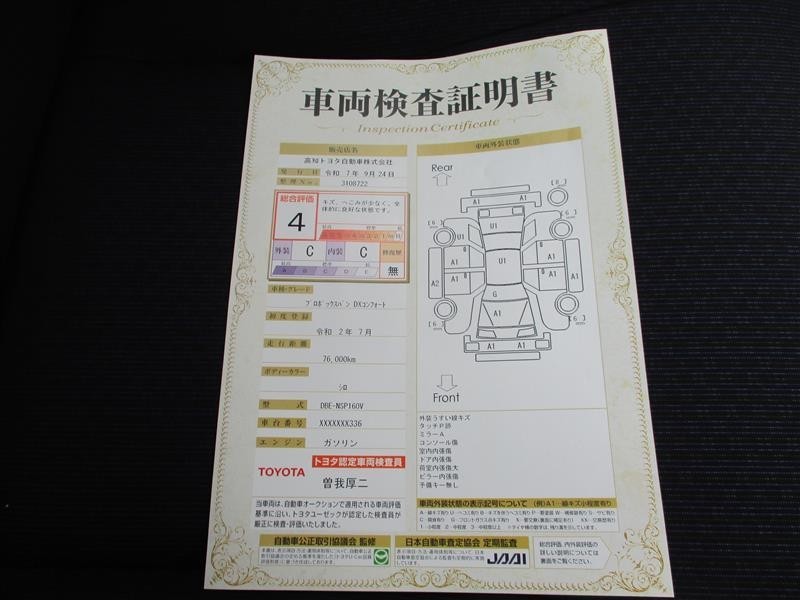 ※ 展示車両には上記と同様の評価点・状態表を「車両検査証明書」として搭載しております。