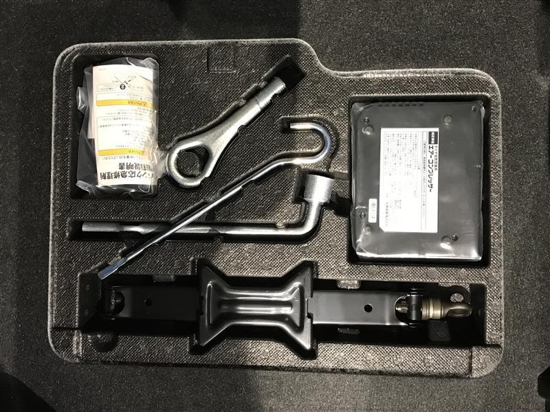【ジャッキ】車体を持ち上げるための工具と【クリップレンチ】タイヤのナットを緩めるたり絞めるための工具。