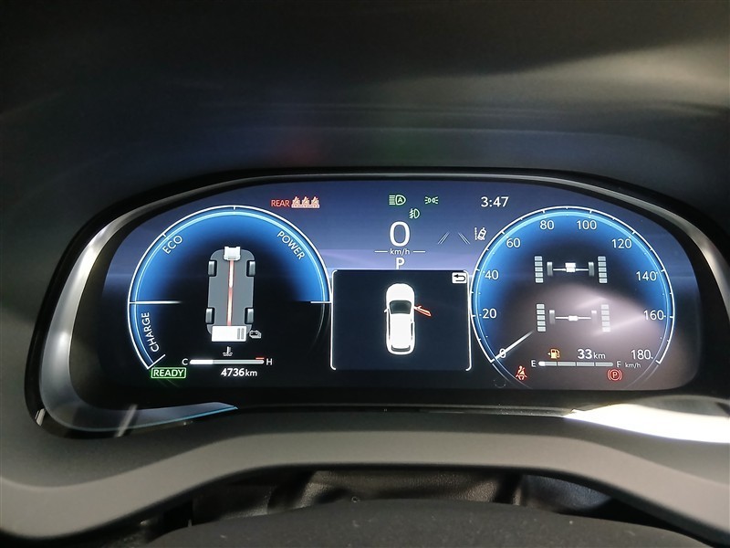 ハイブリッドシステムの状態や走行情報がわかりやすく表示され、昼夜問わずクリアに読み取れる明るさとコントラストを確保しています