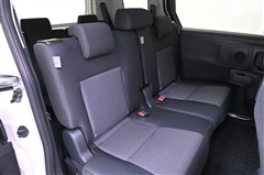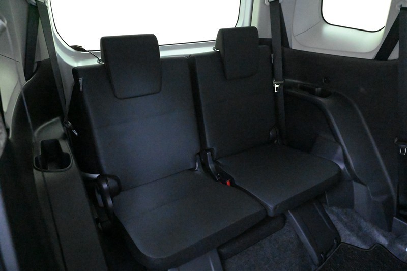 3列目シートです。 大人がしっかり座れる幅広のベンチ風シートです。ワンタッチのレバー操作で2列目シートを折りたためるため、3列目への乗り降りもラクにできます。