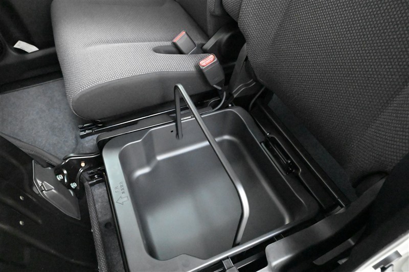 ■助手席シートアンダーボックス 装備。  シートクッションを上げると、取っ手付きで持ち運びができる収納ボックスがあります。