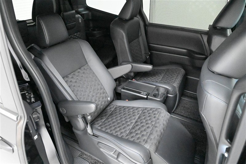 セカンドシートは、ゆったり座れるキャプテンシートです。 ◆シートヒーター、◆オットマン、◆両側アームレスト、◆サイドテーブル(折りたたみ式)、◆後席用サンシェード 装備。