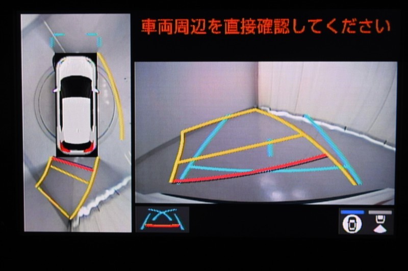 パノラミックビューモニター装備。 車を真上から見たような映像をディスプレイに表示。 車両周辺の状況をリアルタイムで確認できます。狭い駐車場での車庫入れも、枠内に安心して止められますね。