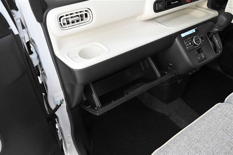 ■置きラクボックス(リヤシート足元に装備)  フロアに直接置きたくない荷物の収納などに便利です。 ついたては片手のワンアクションで立ち上げられます。