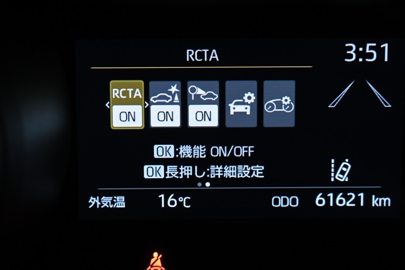 ◇バックで出庫する際などに、自車の左右後方から接近してくる車両をドライバーに知らせる「リヤクロストラフィックアラート(RCTA)」などを装備しています。