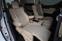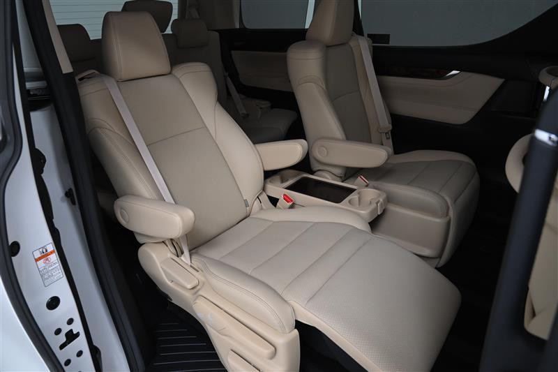 セカンドシートは、ゆったりと座れるキャプテンシートです。◆両側アームレスト、◆リクライニング調整、◆マニュアルオットマン、◆折りたたみ式サイドテーブル(カップホルダー付)を装備。