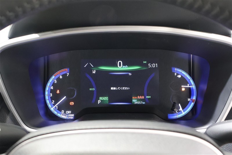 電子キーを携帯し、パーキングブレーキがかかっている状態を確認をし、ブレーキペダルもしっかり踏込みながらパワースイッチを押すとREADYインジケーターが点灯しハイブリッドシステムの始動となります。