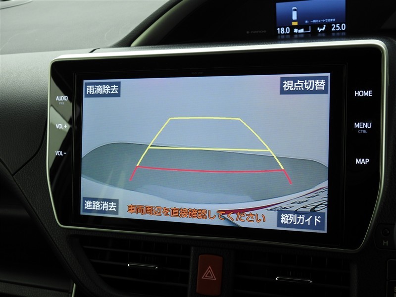 クリアランスソナー付きです。障害物に近づくと、表示や音声で警告してくれるので便利な機能です。必ず目視確認も実施して下さいませ。
