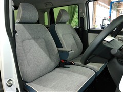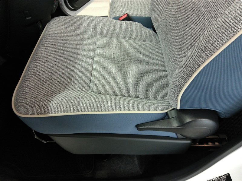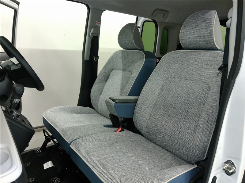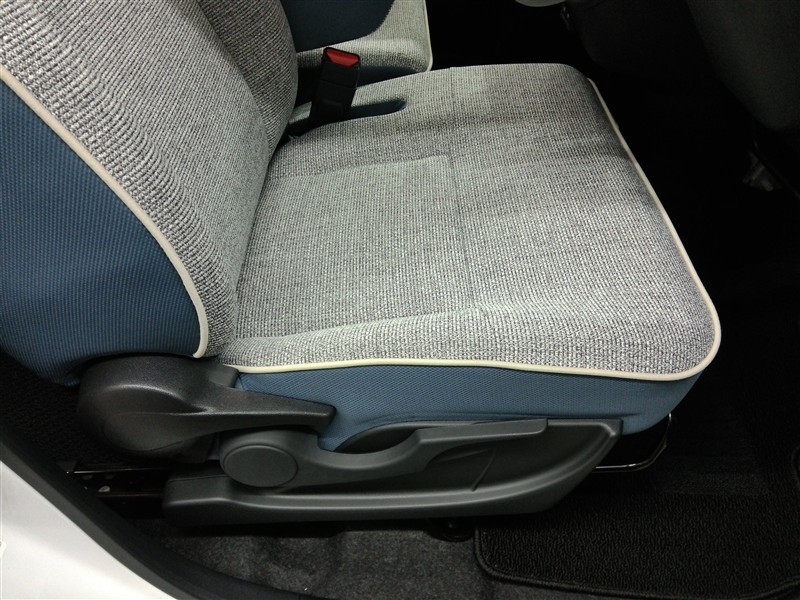 助手席側からの前席ビューです。ファブリックで包み込んだベーシックなシートです。通気性が良くて蒸れにくい上に、保温性も高いので冬場でも冷えを感じにくいです♪
