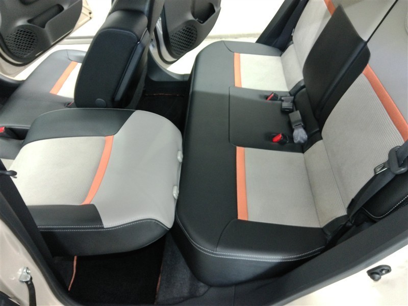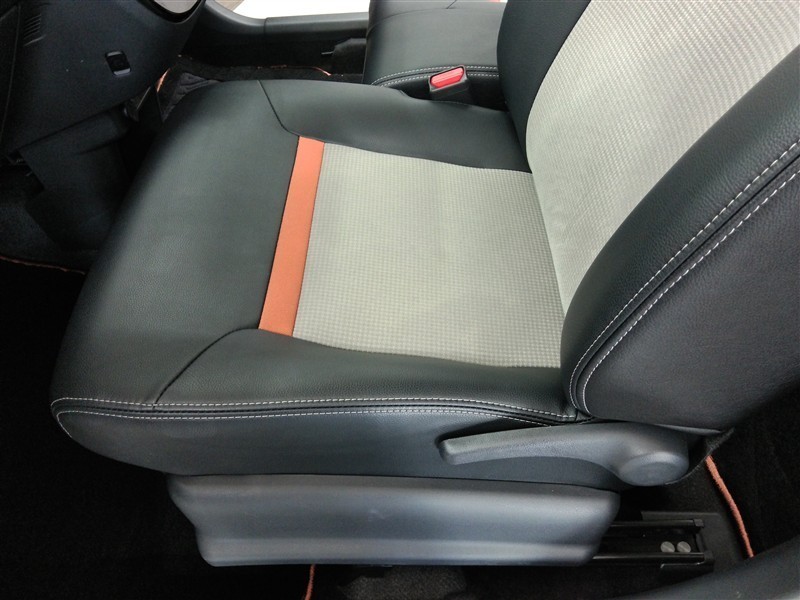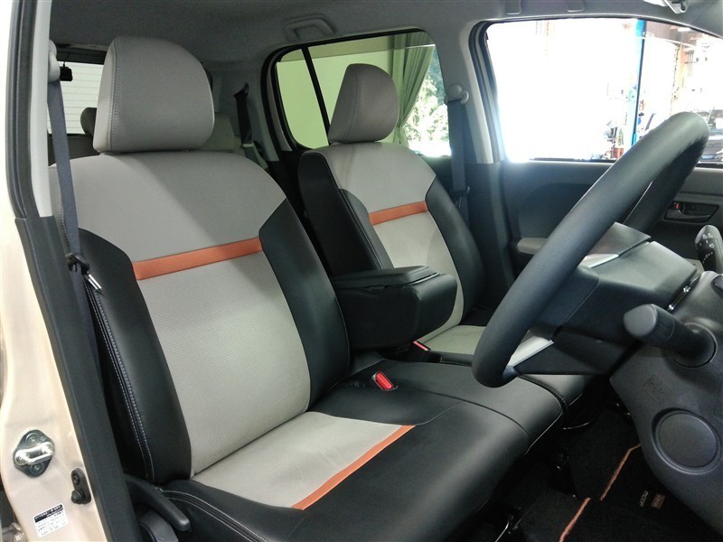 助手席側からの前席ビューです。ファブリックで包み込んだベーシックなシートです。通気性が良くて蒸れにくい上に、保温性も高いので冬場でも冷えを感じにくいです♪