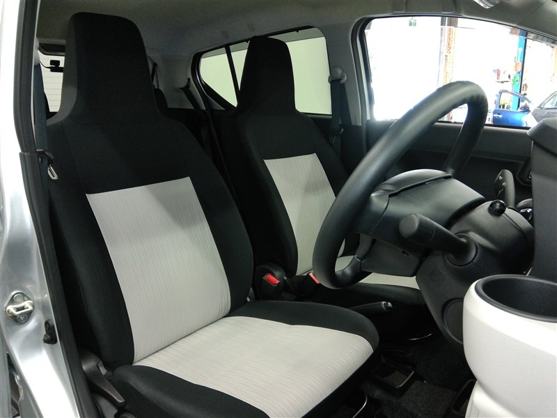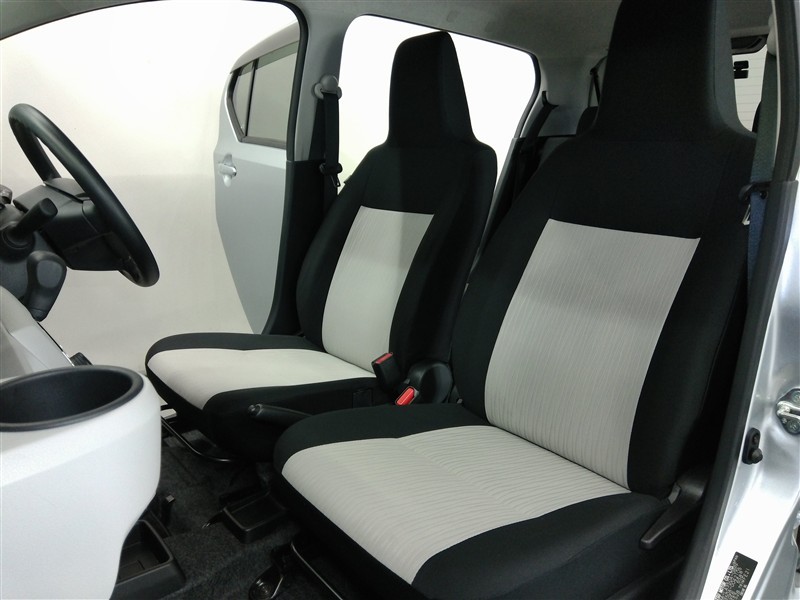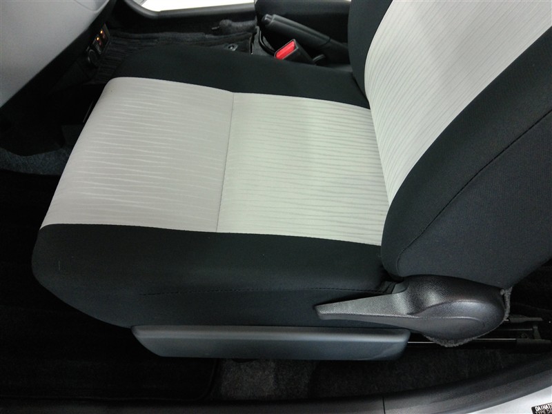 助手席側からの前席ビューです。ファブリックで包み込んだベーシックなシートです。通気性が良くて蒸れにくい上に、保温性も高いので冬場でも冷えを感じにくいです♪