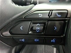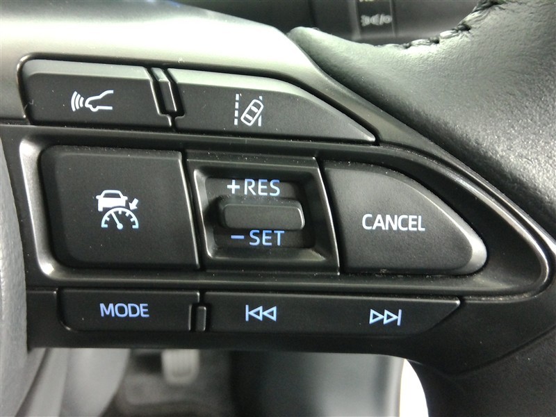 運転席側のステアリングスイッチです。クルーズコントロールの操作とオーディオの操作ができます。クルーズコントロールは高速道路走行時に燃費向上、運転者の疲労軽減に貢献します。