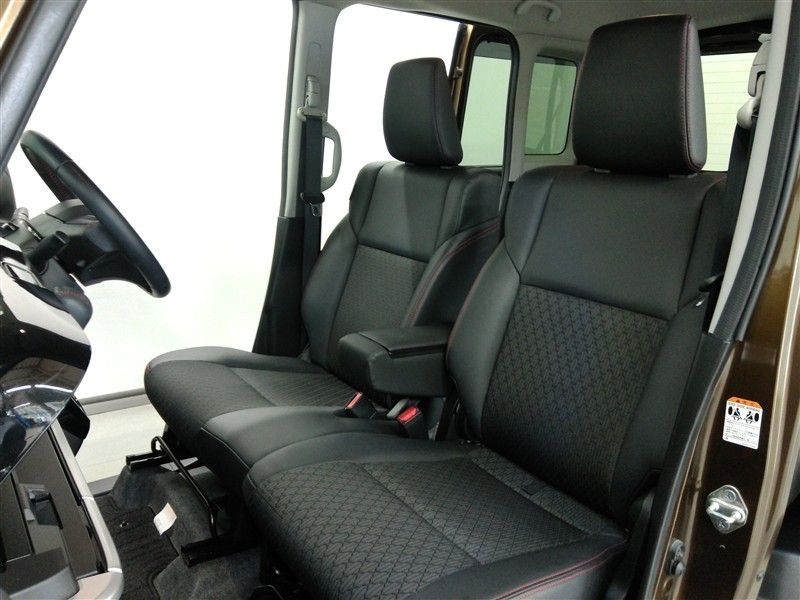 助手席側からの前席ビューです。ファブリックで包み込んだベーシックなシートです。通気性が良くて蒸れにくい上に、保温性も高いので冬場でも冷えを感じにくいです♪
